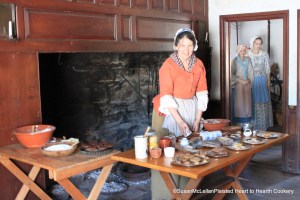 Sunday, February 21, 2010, the Johnson Ferry House in Washington Crossing Park, New Jersey, held their annual birthday celebration for George Washington. The house came to life with demonstrations in every room. In the kitchen, I was telling the story of gingerbread from the earliest receipts of the 15th century to a receipt found in the manuscript receipt book of Martha Custis Washington while preparing the 1747 receipt To make Ginger-bread cakes from H. Glasse’s The Art of Cooking Made Plain and Easy. In the picture to the left, you can see the plates of gingerbread from the different centuries. I have a wonderful slide/lecture presentation on The Evolution of the Gingerbread Man that delights all with the geneology starting in China with a rhizome and culminating with a decorated ginger cookie man.