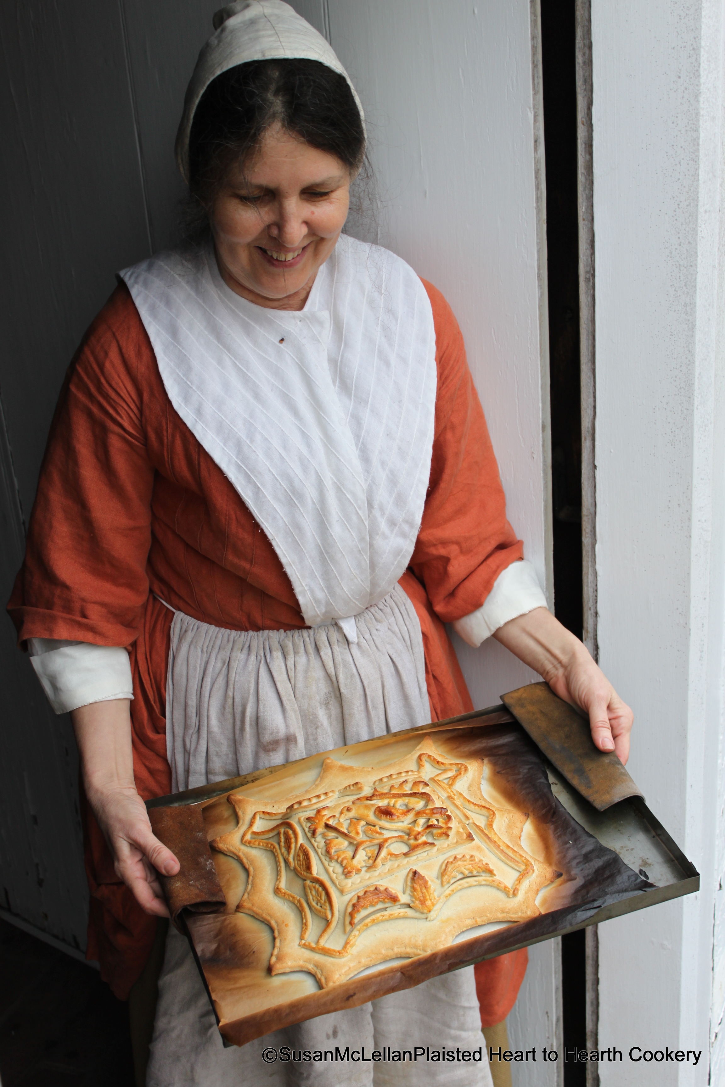Today after what seems like years of preparation, I (with the assistance of great support from volunteer hearth cooks) was successful in reproducing the coffin design for a Lamb Pastey! I will be using exclamation points throughout this post, as I do not think there are words that can express the feelings that I had when I opened the door of the bake oven and found this beautifully browned coffin! (Note: the darkened areas are the effect of the heat of the oven on the parchment paper that I decided to use to line my tin baking sheet.) The process started at about 10:30 a.m. with the melting of the lard in hot water and weighing of 3 pounds of flour. Visitors watched as each sheet of coffin paste was rolled and cut to shape and patiently placed on the coffin. I was still working on the coffin decorations at 3:30 p.m. to complete the bird sitting in a tree with intricate designs and leaves around the central motif. I opened the door and removed the magnificent coffin at 4:19 p. m. Seeing the results, made all the research, tool acquisition and anxiety over the end results, WORTHWHILE!!!! Perhaps my picture with the coffin, at left, shows some of the absolute delight I was feeling holding this masterpiece coffin. Teaching hearth cooking and baking techniques is something I delight in doing as well, I have a filled hearth cooking class March 20th at Bolton Mansion, but still have some openings in the class at the same location on March 27th. And May 22nd, 2010, I will be teaching 18th century confectionery skills. Come join me in the fun! Visit my website www.hearttohearthcookery.com for more information.