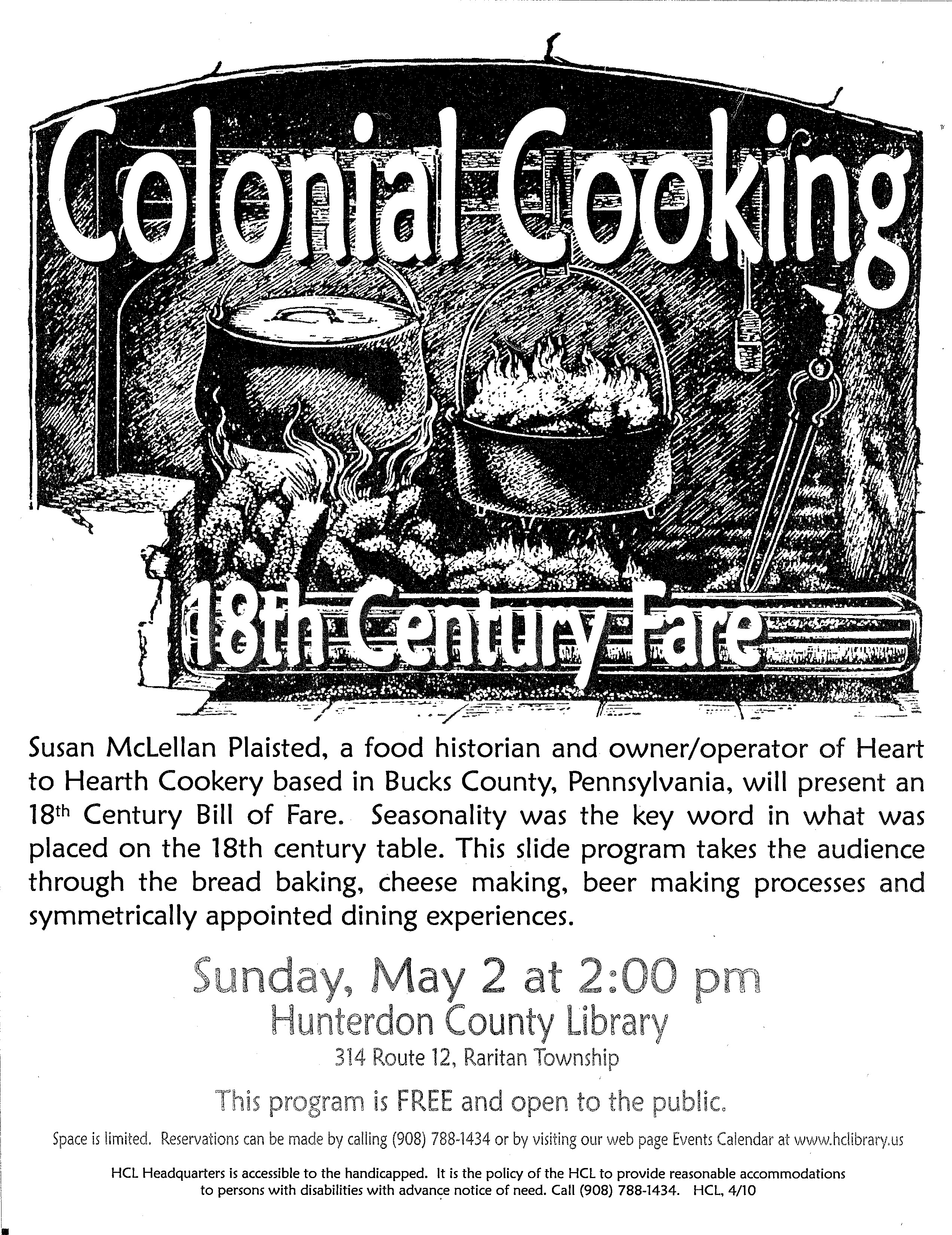 I have a number of power-point food history presentations that I give to historical societies, annual meetings, service clubs, Quester groups, libraries and many other organizations. Earlier in this month, I presented my program on the 18th century Bill of Fare to a group of very interested participants at the Hunterdon County Library. (Program flyer-left) It was a wonderful experience for me to share my experimental archaeology of food and explain many of the food preparation technologies of the past and the seasonal nature of foods presented at table.