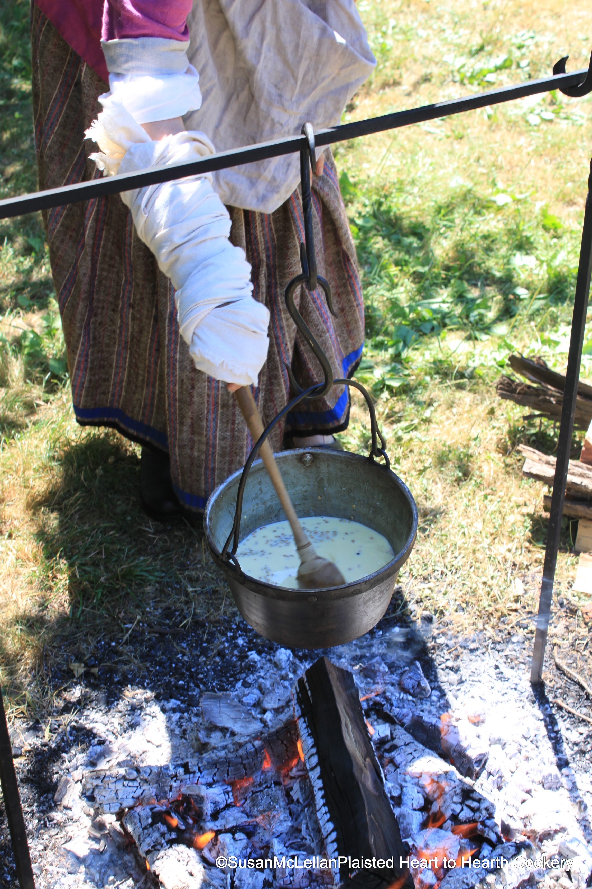 This is my first ice cream (cream ice) for National Ice Cream Month 2010. And it contains coriander! This is a different Royal Cream Ice than the one I posted last year. A different reciept that you infuse bruised coriander seed, cinnamon, candied orange peel and candied lemon peel in cream mixed with egg yolks. You can see me (pictured left) continually stirring the custard as the flavor is infusing. The coriander seed is floating at the top of the kettle. I have my arm wrapped in linen to protect it from blistering in the heat of the fire and the day! The blend of flavors was very pleasing and many visitors were in awe of the blend. This is the first of a number of ice cream receipts that I will make this July-National Ice Cream month 2010!