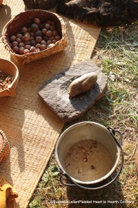 Today I reproduced what John Heckewelder (1742-1823), a Moravian missionary in Pennsylvania, described the Indians preparing. They pound the nuts in a block or mortar, pouring a little warm water on them, and gradually a little more as they become dry,until, at last, there is sufficient quantity of water , so that by stirring up the nuts, the broken shells separate from the liquor, which from the pounded kernels assumes the appearance of milk. This being put into the kettle and mixed with the pottage gives it a rich and agreeable flavour… Peter Kalm , a Swedish botanist also describes witnessing this process of preparing hickory nut milk in 1749. In the picture, the hickory nuts are in my elm bark basket. The stone mortar and pestle was used to crack and pound the nuts and then the “nut milk” was finished in my small trade kettle. This “nut milk” would then be added to my trade kettle with the hominy corn, beans, squash, and dried venison.
