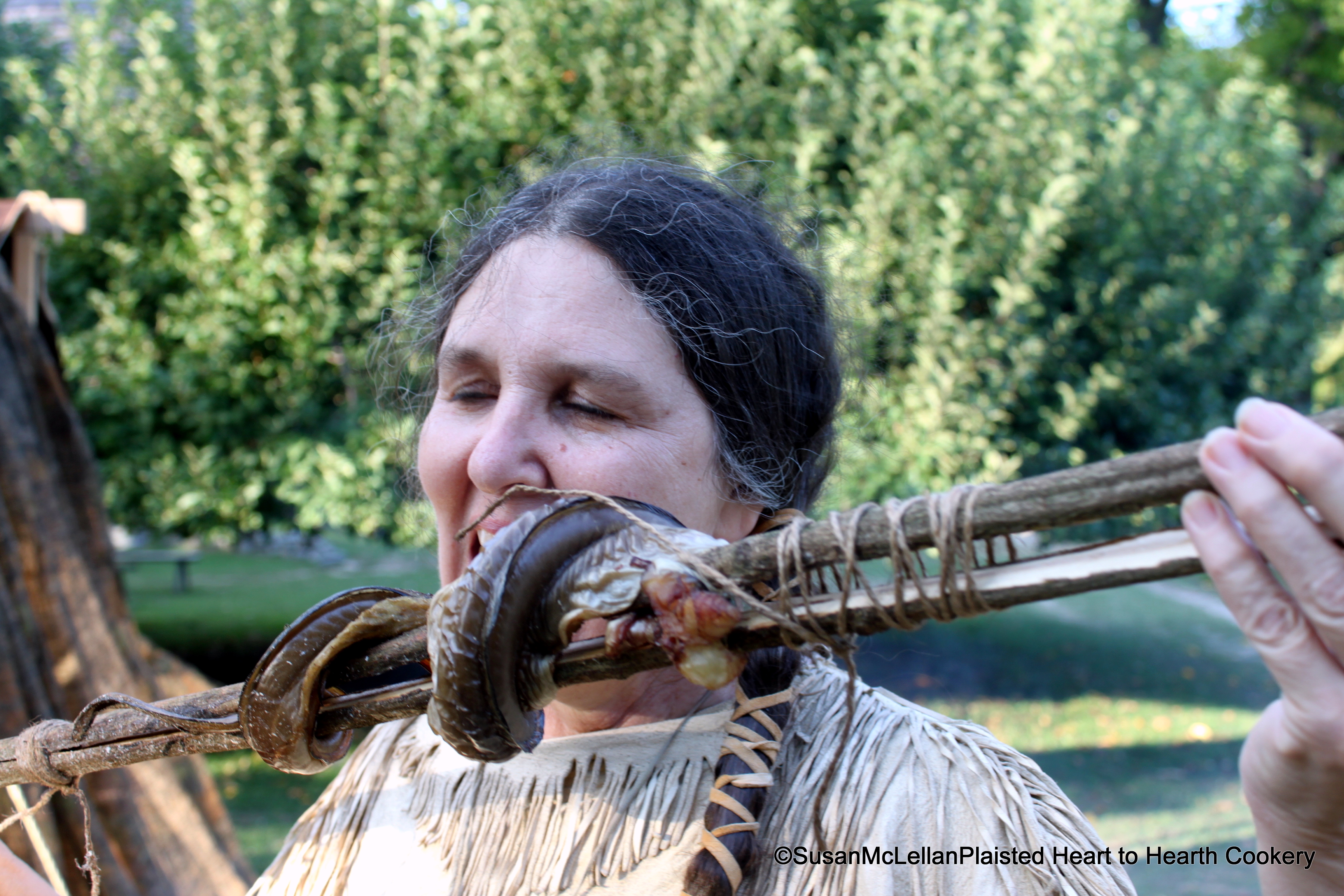 Today at the first day of Phillipsburg Manor’s Green Corn Festival, I used the “Indian” method of roasting eel that John Bartram (first American botanist) describes in his Observations on his journey from Pennsylvania to Onondaga in 1743. He wrote: Their way of roasting eels is thus: they cut a stick about three foot long and as thick as one’s thumb, they split it about a foot down, and when the eel is gutted, they coil it between the two sides of the stick and bind the top close, which keeps the eel flat, and then stick one end in the ground before the fire. Look carefully in the picture for that stick with the eel coiled between the split stick. All that was required was to turn the stick in the ground to roast the eel evenly. And the result-it was very tasty!