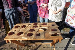 Yes, what you are looking at in the picture are really chocolate cakes! The term “cake” had a much broader meaning in the 17th and 18th centuries. While the chocolate cakes look more in the form of what we know as cookies today, the English primarily referred to cookies as small cakes. Thus the 100% pure chocolate with ALL its cacao butter that comes off a metate are called chocolate cakes. The “cakes” would then be grated into a chocolate powder and mixed with hot water in a chocolate pot. Chocolate was a beverage! This picture was obviously focused on the chocolate as all the participants in the workshop are headless. But the class was proud of all the chocolate cakes they made from roasting cacao beans and processing the roasted beans on a metate. This experience of making chocolate cakes is available to you with my chocolate workshops. I have one chocolate workshop each year in February near my home but the metates have traveled and workshops can be planned at any location near you with a hearth.