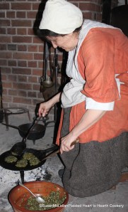 I have often wondered how many different receipts (recipes) there are for the early spring spinach! There seems to be so many that this vegetable is different each time it appears at an 18th century table. Yet I have not found one that proposes to preserve spinach in any way-which does not surprise me. Recently I prepared the receipt To make Spinage Fritters which is pictured to the left. After the Spinage was boiled, drained and minced small, grated white Bread, Nutmeg, Ginger and Cinnamon was put to it. After adding the Yolks and Whites of Eggs, as much Cream as will moisten it, and currants, that have been swell’d in warm Water, the fritters were dropped by spoonsfuls and cooked on the griddle.