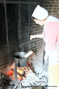 For those of the wealthiest status in the 17th century, white was a desired color for the table. The whitest sugar for sugar plate, the whitest flour for bread, and the whitest salt for the table. White asparagus (or sparrow-grass as it was frequently called in 17th century England) could be grown by gardeners by keeping the emerging spring stalk covered by dirt. White asparagus is produced by the same plant that produces the green but the white are deprived of light so that chlorophyll (green) cannot be produced. I am taking the cooked white asparagus from the kettle by the string that ties the bundle. It will be served with a sauce prepared with cream, herbs, yolks of egg, and sugar. Visit my website at www.hearttohearthcookery.com