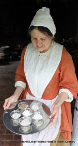 The comfits in the six handblown glass sweetmeat glasses represent 12 days of comfit making. Each time I use my comfit pan, I apply twelve charges (layers) of sugar syrup to each seed or spice. My goal is to have 60 coatings of sugar on my carraway seeds. The center sweetmeat glass contains clove comfits with 24 coatings of sugar. Starting with the darker colored comfits by my hand and going clockwise are caraway comfits with 12 layers of cochineal colored sugar, caraway comfits with 48 charges of sugar, caraway comfits with 24 layers, caraway comfits with 12 layers, and last clove comfits with 12 charges. I find the presentation of the comfits on my pewter reproduction tulip plate very pleasing. See my food history source listing for more information on the plate.
