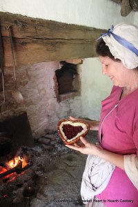 I was overwhelmed by the interest in my post on a Tart of Strawberries that I am posting more information. The 1653 receipt is A Tart of Straw-Berries and the auther is Anonymous. The strawberries available at that time were the very small wood strawberries. If I do not have enough of the small berry, I try to find the smallest of the local berries to use. I put them in past..one by another as thick as you can and then take Sugar, Cinamon, and a little Ginger finely beaten, and well mingled together, cast them upon your Straw-berries. The actual receipt (recipe) has the strawberries covered with a lid finely cut into Lozenges. Because I was using a heart-shaped redware baking dish I opted to leave off the Lozenges for the look that I wanted.
