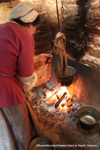 Once all the ingredients have been mixed for the pudding, it is time to prepare the pudding bag. Pudding bags are approximately one yard square of linen that can be tied with twine to create a bag. It depends on the type of pudding receipt (recipe) how to prepare the cloth but the first step of wetting the cloth is the same. In the picture, I am dunking the cloth in the heated water of the kettle. For some puddings, the bag is floured and/or buttered, and for the pudding that I am preparing, all that is needed is for the cloth to be wet.