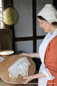 In order for me to produce cheese during dairying season (Spring, Summer and Fall), I need to prepare a rennet stomach for the enzyme rennin to set the milk into curd. The total process takes several days and starts with obtaining a newborn calves stomach. This stomach was cut lengthwise and cleaned, soaked in brine, and the last two days covered with salt and turned. On the board in the picture, is my new stomach thickly coated with salt ready for the next steps. Hanging on the wall by the window, is another rennet stomach completely processed and has the appearance of parchment. More steps in this process will follow.