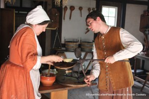 The wafer iron is opened when one smells a done wafer, listens to the sound of a cooking wafer and watches the steam. I use all three senses. When done my nephew, Alan, opened the iron and I removed the wafer. The wafer is very soft and fragile as it comes off the iron. Frequently, I roll the wafer off the iron with the handle of a wooden spoon. On this occasion, my goal is flat wafers and I found the removal required very great care.