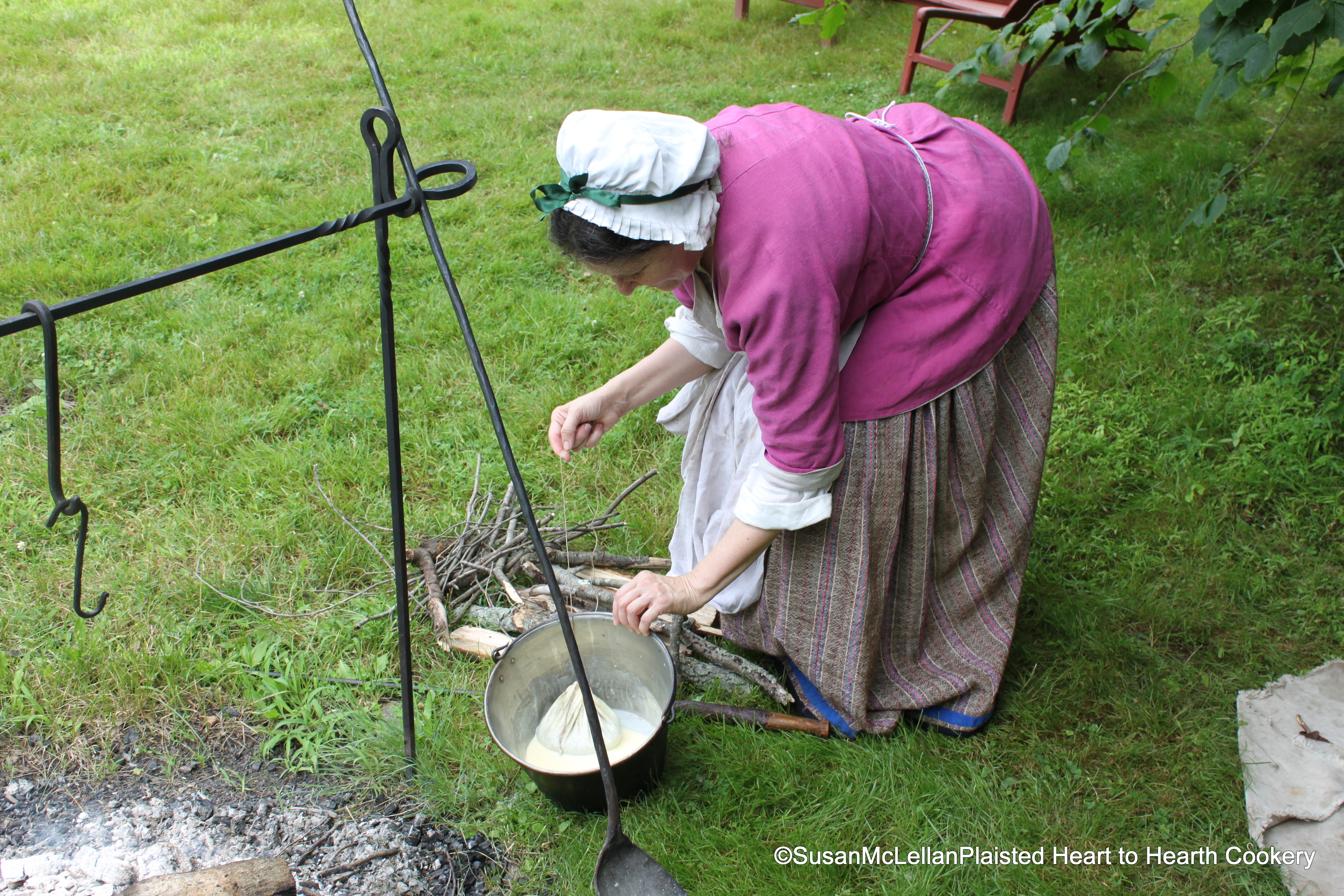 I have been curious about the receipt for White Coffee Cream Ice since I first read it. How could it be white? One roasts green coffee beans, breaks the very dark brown roasted beans into “grains”, and infuses the coffee flavor with the broken beans in a linen bag. In the picture, I am lifting the bag from the cream, egg yolk and sugar mixture and you can see the color is still “white”. This is my favorite flavor – until I make my next 18th century ice cream!