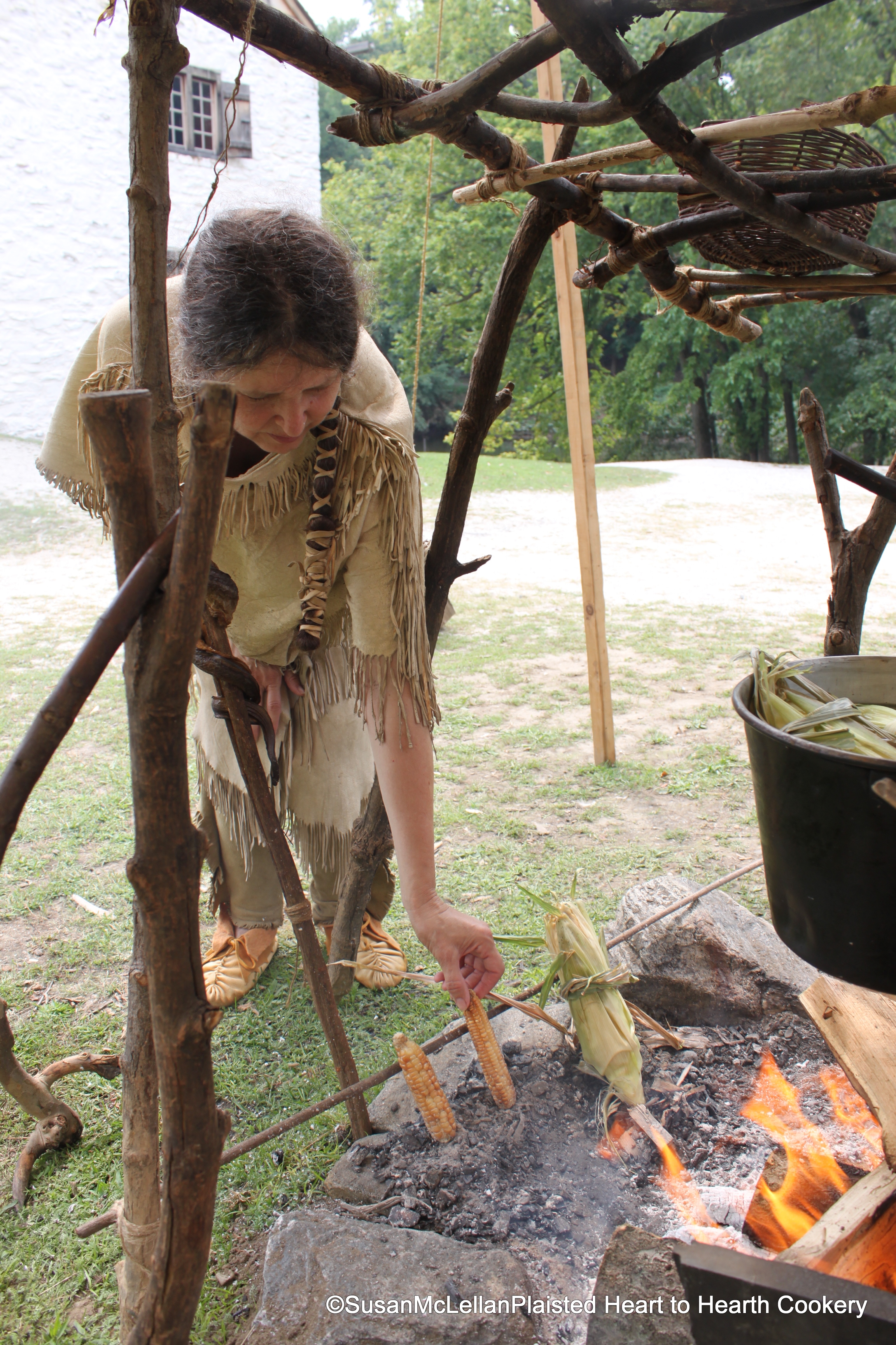 This picture shows green corn processed in three ways. I am turning the Lenape white flour corn as it is browning nicely for tasemenana (preservation of green corn). On the same stick is a roasting ear of green corn with the green husks tied after the silks were removed. In the trade kettle to the far right of the picture is a third method of preparing green corn by boiling.