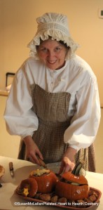 One of the receipts that the participants prepared at my hearth cooking class at Historic Speedwell was Potato Pumpkin with forcemeat. It was important to “get one of a good colour and seven to eight inches in diameter, cut a piece off the top and take out seeds, wash and wipe the cavity and fill the hollow with a good forcemeat”. The pumpkins appearance was like a glossy ceramic and it was a treat to eat. I am cutting myself a slice in the picture.