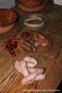 The Sausage for Summer Use in the front of the picture are newly stuffed. In the plate, the sausages on the right have started the drying process and those to the left have been both dried & smoked and are now preserved.