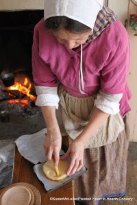 To make March-pane, I took a pound of almonds, blanched and put to them three quarters of a pound of double refined sugar, and beat them with a few drips of rose-flower water. Having stored many batches of march-pane, I was ready to prepare the receipt (recipe) To make March-pane. In the picture you see me working the paste with a boxwood confectionery tool to make an edge about it prior to the baking in an oven. The march-pane sits on a wafer made ahead with my wafer iron.