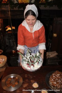 This early 1600’s receipt (recipe) is festive in any century and simple as well. In the bottom of my punch bowl, I placed pomegranates (apples can be used as well) and stuck branches of rosemary into the fruit. By whisking both cream and egg white until stiff, the effect of snow is created. This “snow” was used to dip the gingercakes (pictured to the right) stacked in a sweetmeat cone. Glass sweetmeat dishes hold fennel comfits.