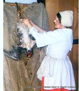 This picture of my plucking a rooster is over ten years old! And what memories it brings back to me! I have not kept count of how many chickens, roosters, turkeys, peacocks that I have plucked but it is many. Fortunately, I did not have to do the “deed” but I would find the bird hanging on my “plucking rack” and still warm which is the best time to start plucking. I would use the wet method of plucking to limit the tearing of the skin and allow visitors that “ah ha” moment of realizing that the birds packaged in the grocery store were living birds! It is an awesome demonstration but for some aspects I would place myself in an area where visitors had a choice of whether to view or not. Roosters were frequently awaiting me as only one is needed for the hens.