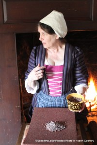 After roasting raw, fermented cacao beans to the flavor of chocolate, the outside hulls are removed and the remaining roasted bean is now called a nib. In the picture, both in the ceramic with the date 1699 that I am holding and on the granite metate, are nibs ready to be rolled into chocolate liquor on the heated metate.