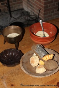 To prepare a Cowslip Pudding, after gathering the cowslips, Naples Biscuits are grated and mixed with cream. The cream is in the brass posnet. My next hearth cooking class is May 19th, 2012.