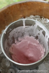 This is the Fresh Raspberry Ice Cream as it looks just completed in the sabotiere. The ice cream is at the bottom and sides after much scraping and moving up the sides with the pewter scraper.