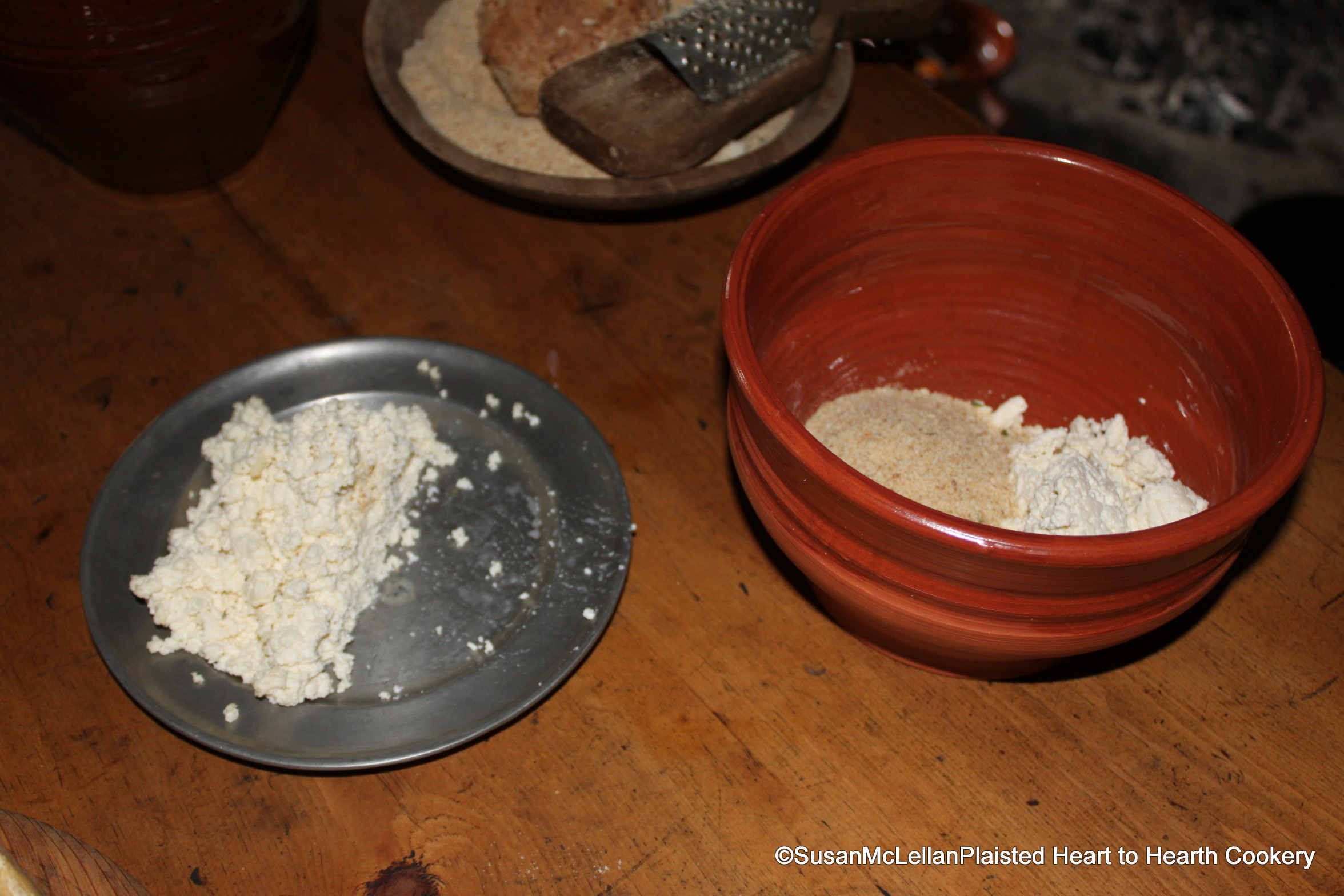 The G. Penn receipt-To Make a Puding or Cheese Lofe– starts with the instructions: Take a gallan of new milk, And make a tender Curd of it, Lett it bee well Whayed, Then putt as much grated breed as curd. In the pewter plate is the tender curd from a gallon of new milk. I took half the curd and the same amount of grated bread. The grater and bread crumbs are in the wood bowl in the rear of the picture.