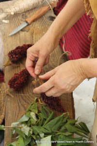 To prepare staghorn sumac for drying, a needle made from a deer bone is used to put cordage through the stem.