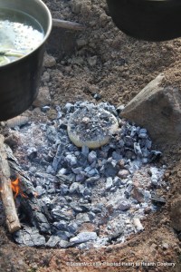 The Indian Bread is baking as John Heckewelder (see post on Wanishi! John Heckewelder) describes with clean ashes from the burning of oak. You can hardly see the bread but the aroma is so corn-tastic!