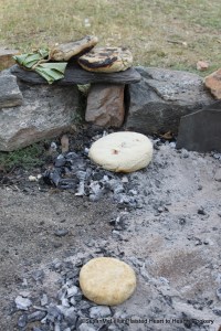 As per John Heckewelder, their (Lenape), bread is of two kinds; one made up of green corn while in the milk, and another of the same grain when fully ripe and quite dry. The green corn bread is to the upper left corner of the picture next to the plain Indian Bread made of the dry flour corn. Baking on the embers are venison bread (front) and chestnut bread.