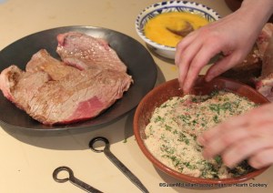 The steaks cut from the rump and heated a little are now ready to be rubbed with egg yolk and strewn with a mixture of crumbs of bread, chopped parsley, lemon peel shred fine, pepper and salt, chopped marrow, and grated nutmeg.