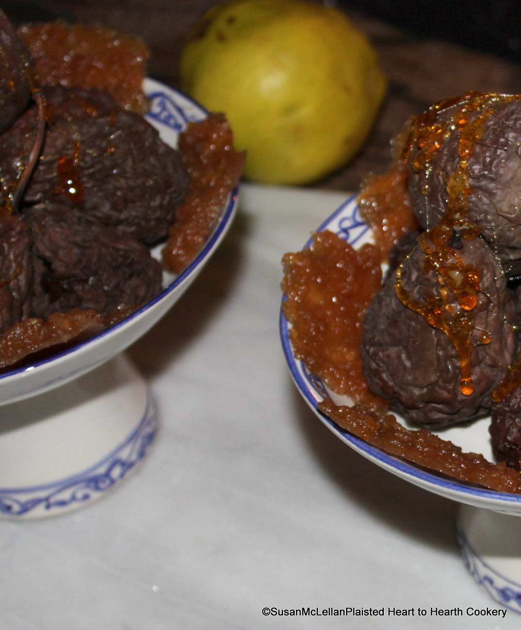On the same tazza with the dried pears, shining like jewels for the banquetting (or dessert) table, are quince cakes. In the back of the picture, between the two tazzas, is a quince. Quince, that many identify as similar in appearance to a pear or a Yellow Delicious Apple, are not pleasant to eat raw like a pear or apple. The quince are high in acid and pectin and require some heat treatment to be made palatable.