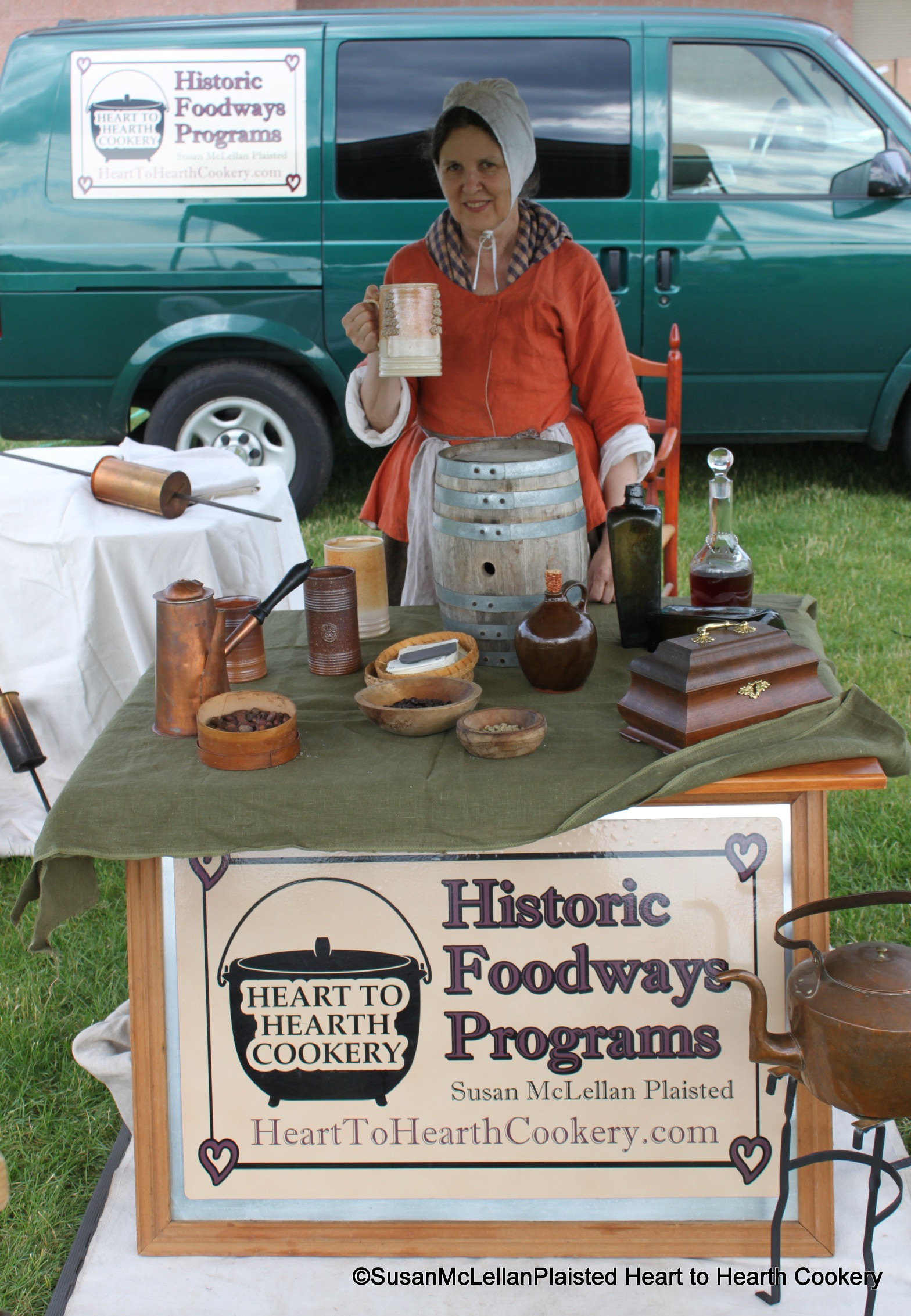 Through my food history business, Heart to Hearth Cookery, I present many types of food history programs in a year. Pictured is my 18th Century Beverage demonstration and I am holding a stoneware tavern tankard.
