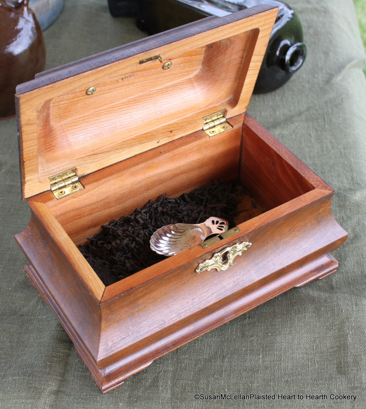 This wood tea caddy contains a silver shell-shaped tea caddy spoon and individually hand-rolled bohea tea leaves. Carl Linneas, a 17th century Swedish botanist named this popular Chinese black tea, Thea Bohea.