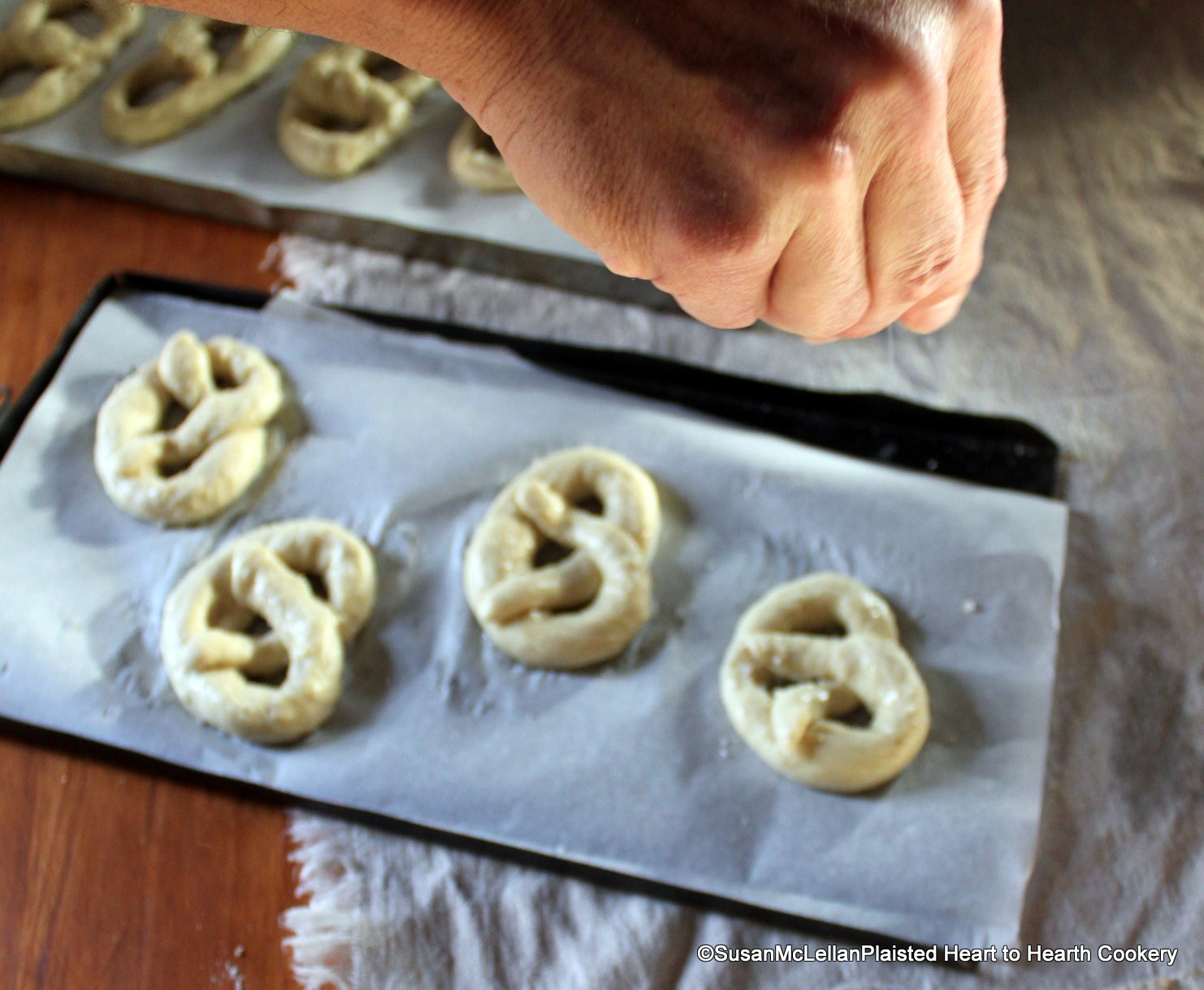 Pretzels have been considered an ancient Lenten bread prepared with ingredients that maintained the fast and shaped in the form of crossed arms over the breast in prayer. Salt is being sprinkled over the lyed pretzels.