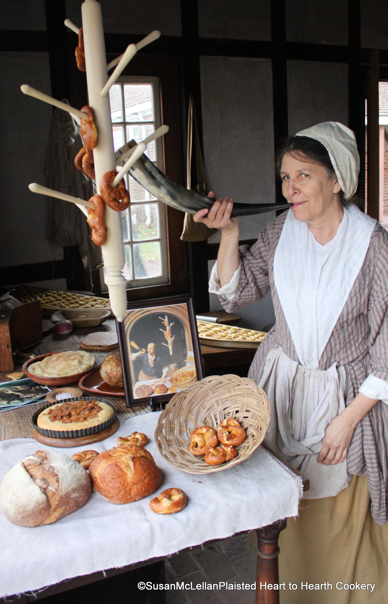 With the painting The Baker by Adriaenszoon displayed, I am blowing a cow’s horn as the painter depicted letting all know that the pretzels (arranged on the pretzel hanger) and in the basket and breads are out of the oven. (See the previous post for a closer look at The Baker)