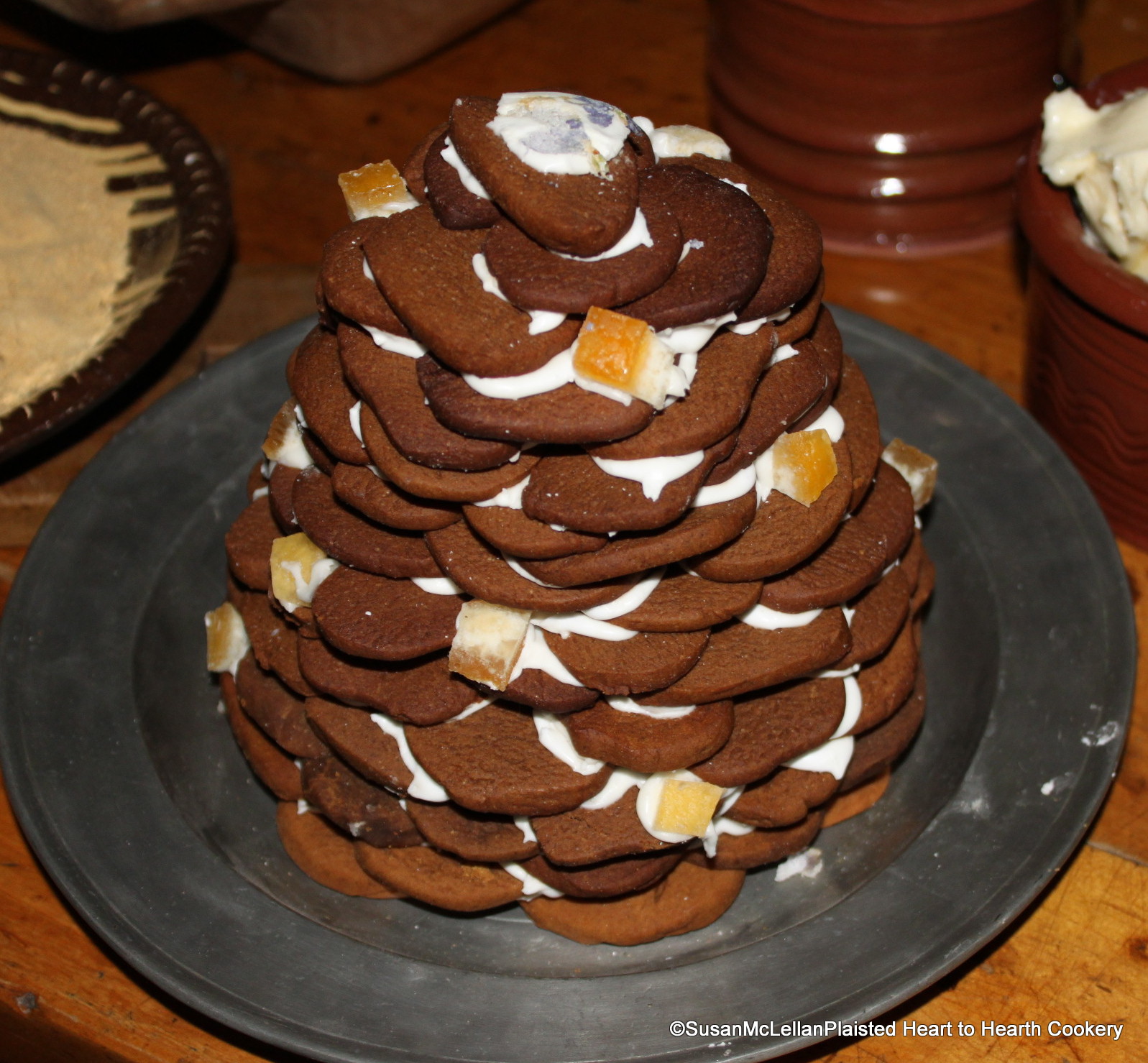 The very old term sweetmeat has nothing to do with meat and EVERYTHING to do with sweet. The Ginger-Bread Cakes are held together with an icing made of whisked egg whites, double refined sugar powdered fine and rose flower water. The cone is decorated with candied orange peel and candied violets.