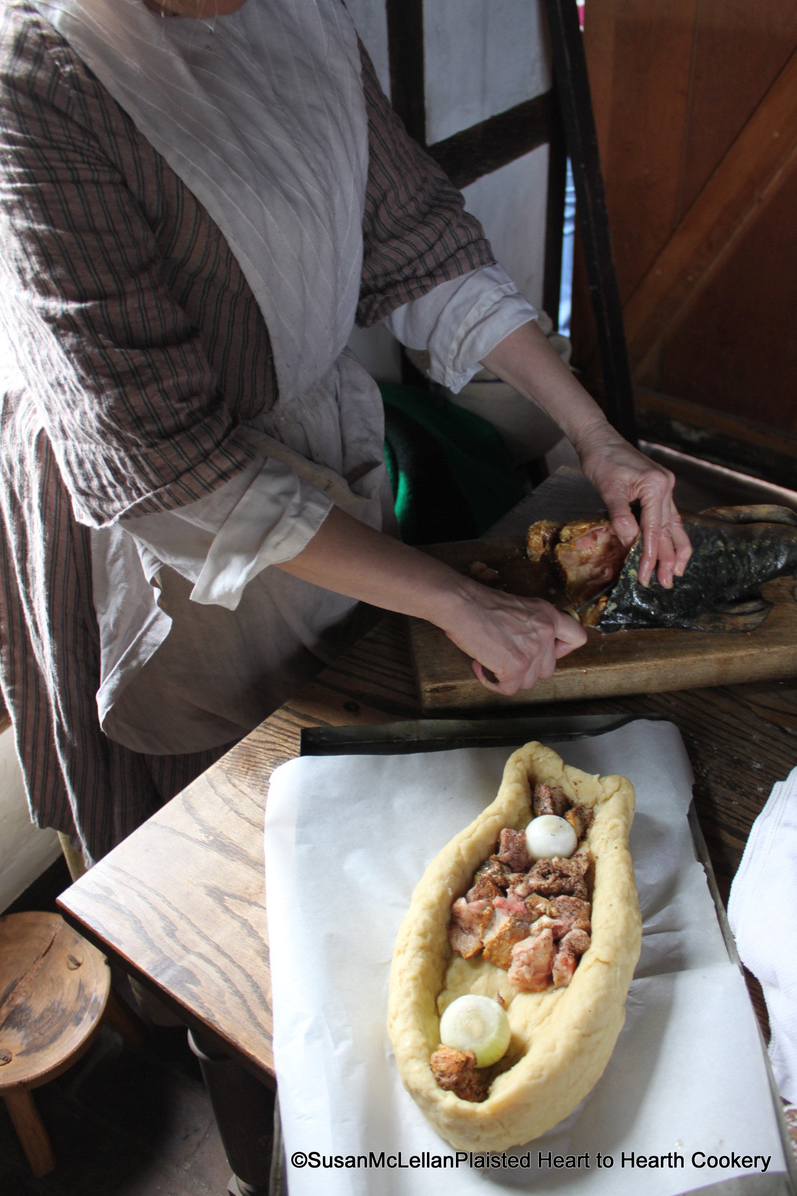 The raised fish-shaped pie (coffin) was filled with pieces of sturgeon as big as a walnut and an onion or two whole.