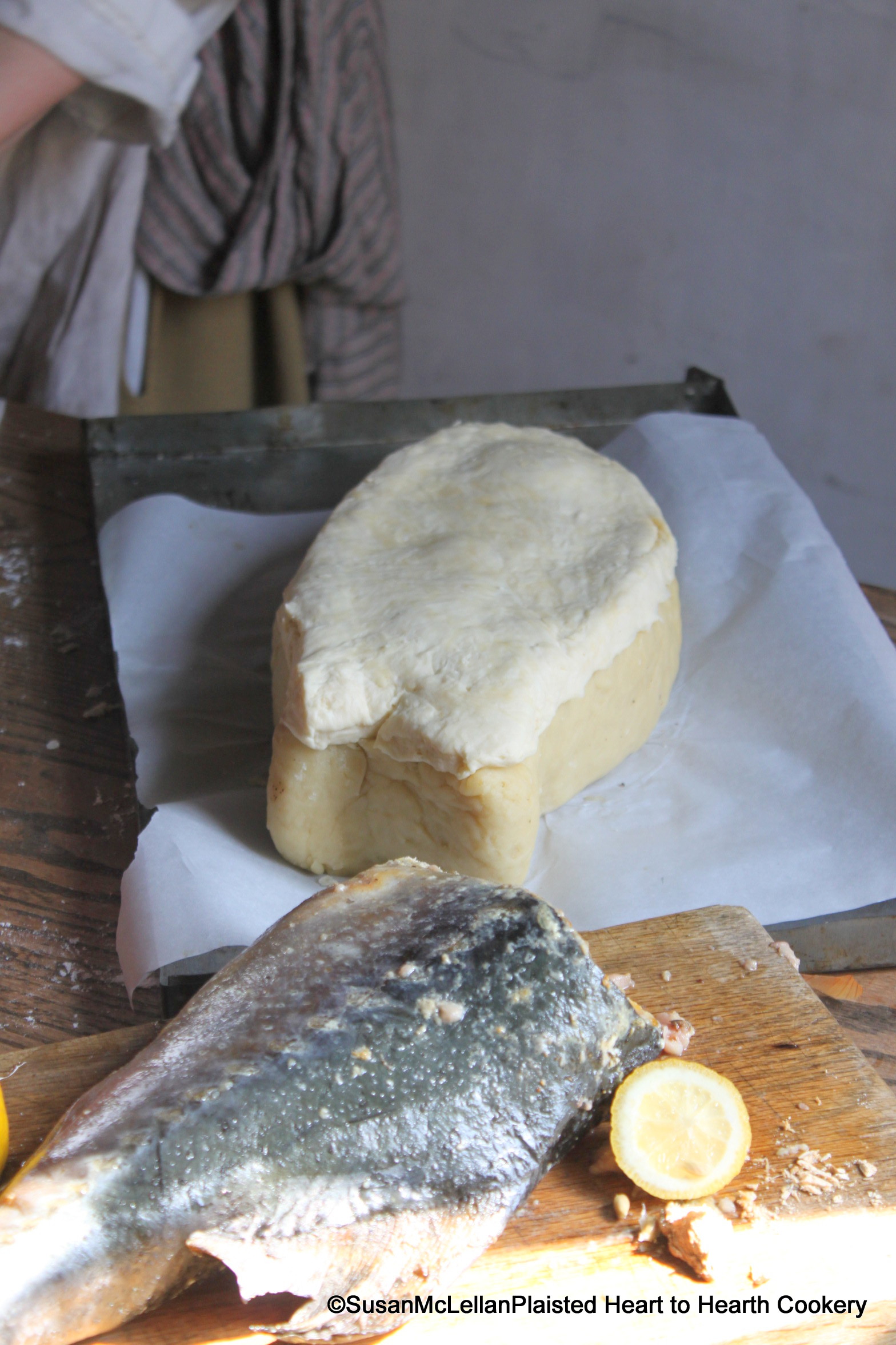 After making a hot paste and raising a coffin in the shape of a fish and filling the coffin with sturgeon, onion and spices; the lid (prepared from a cold paste (pastry) of white flour, butter, egg and cool water) was added. This lid is now ready to be decorated with pastry-work.