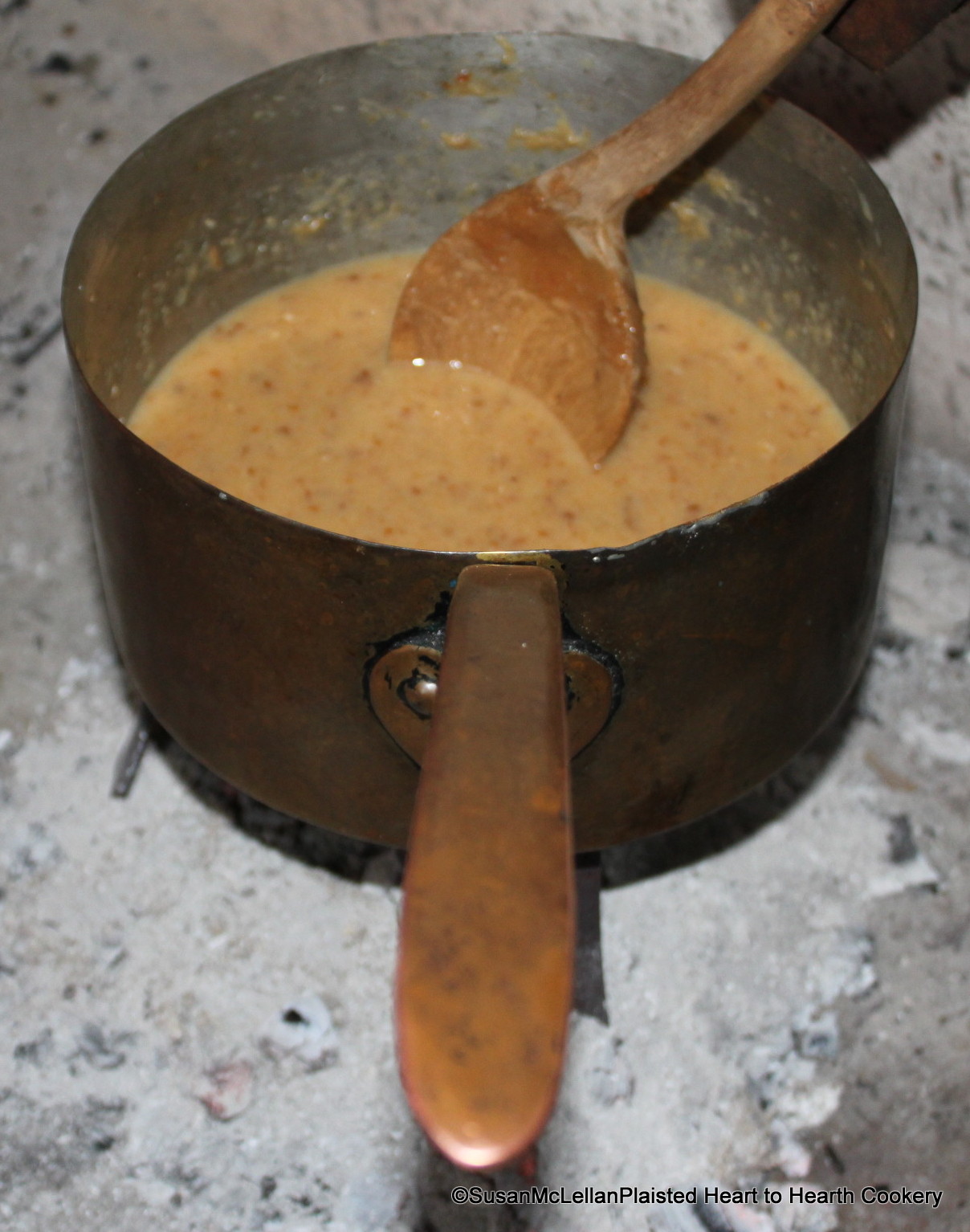 After the gooseberries (for the Gooseberry Cream) were mashed and sieved, the quantity of gooseberries were measured. To a Quart of the Pulp, you must have six Eggs well beaten. Heat the Pulp, when it is hot; put in an Ounce of fresh Butter, sweeten it to your Taste, and put in your Eggs, and stir them over a gentle Fire till they grow thick.