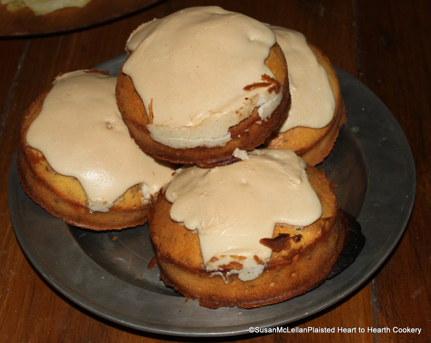 The receipt (recipe) for A Rich Seed Cake was baked in tin cake hoops in a bake oven and iced in cake hoops. (See previous posts). The buttered cake hoops were quite easy to remove and this is the presentation of the cakes on the table.