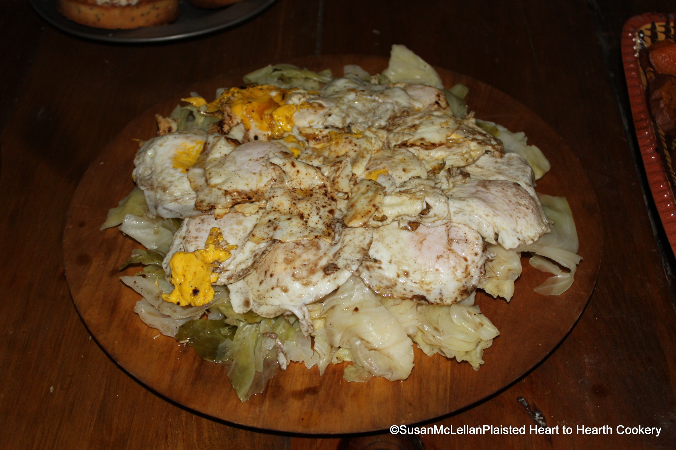 After the Cabbage-lettice is stewed enough (see previous post), lay them in your Dish and fry some Eggs nicely in Butter, and lay them on.