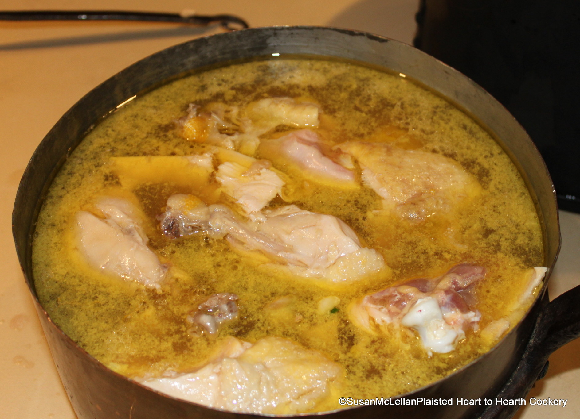 After the chickens for the Fricasee of Chicken were boiled rather more than half, the receipt (recipe) directs to let them cool, then cut them up, and put them to simmer in a little gravy made of the liquor they were boiled in. The chickens were cooled, the liquor strained and all put in a large tin-lined copper saucepan for simmering. The copper being too full, the chicken and liquor were transferred back to the original boiling kettle for the simmering