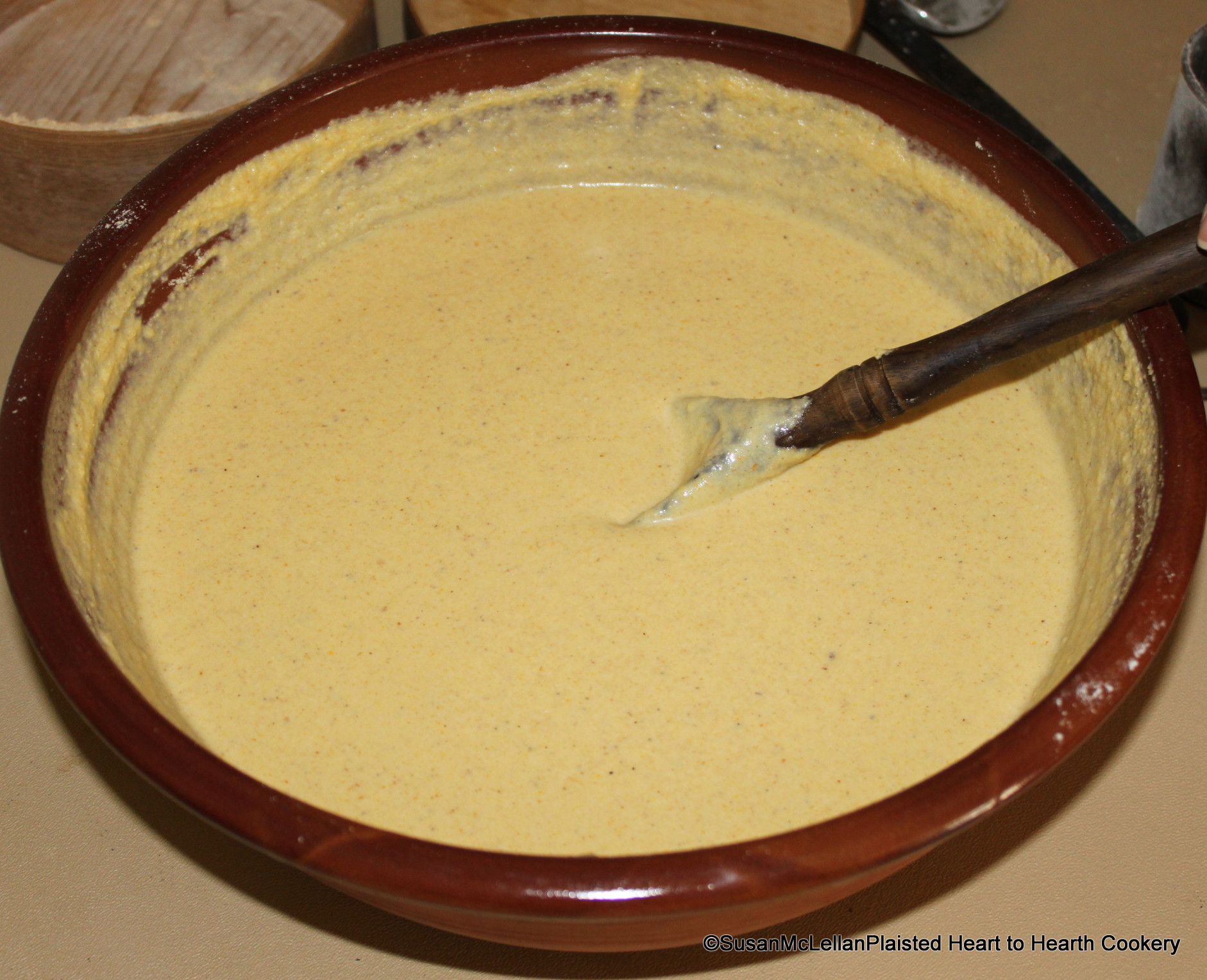 To the yellow Indian meal and wheat flour (see previous post) are added alternately a quarter of a pound of fresh butter in a quart of milk and four eggs beat very light. The whole must be beaten long and hard.