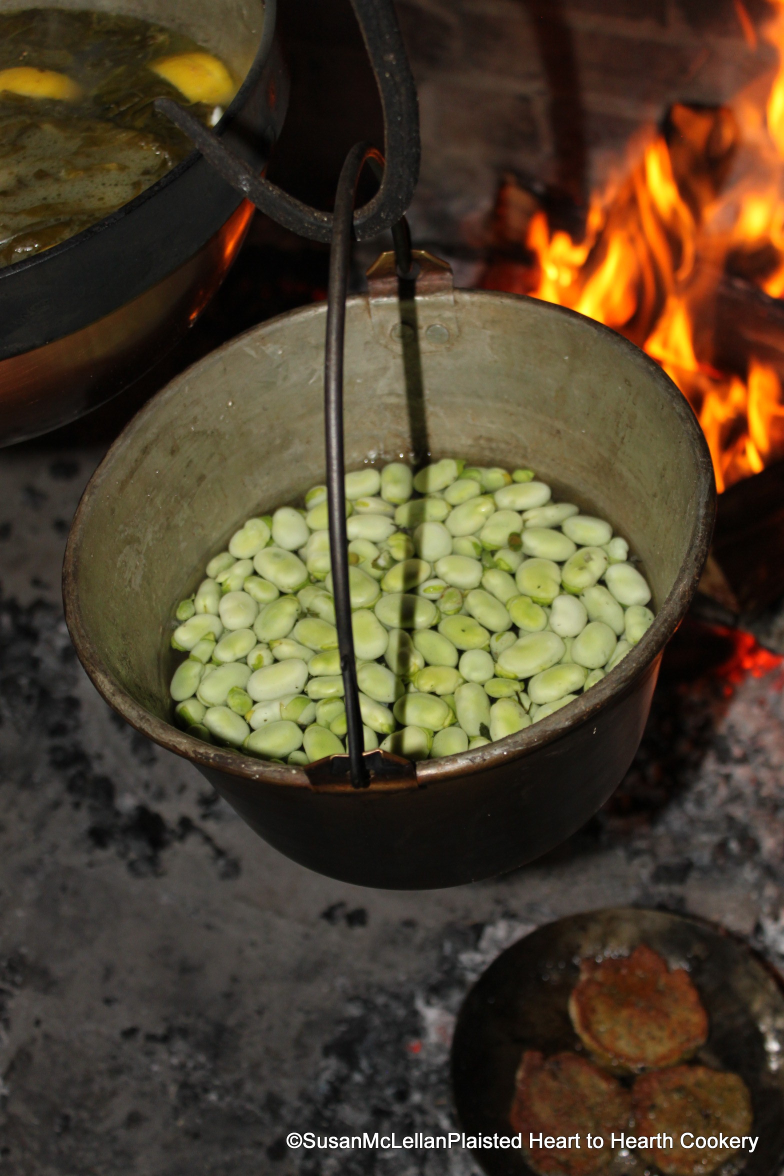 This is the first in a series of Dutch receipts (recipes)-To stew Fava Beans. The first step is to remove the beans from their pods and cook until done. These beans are in a kettle in water over the fire to cook.