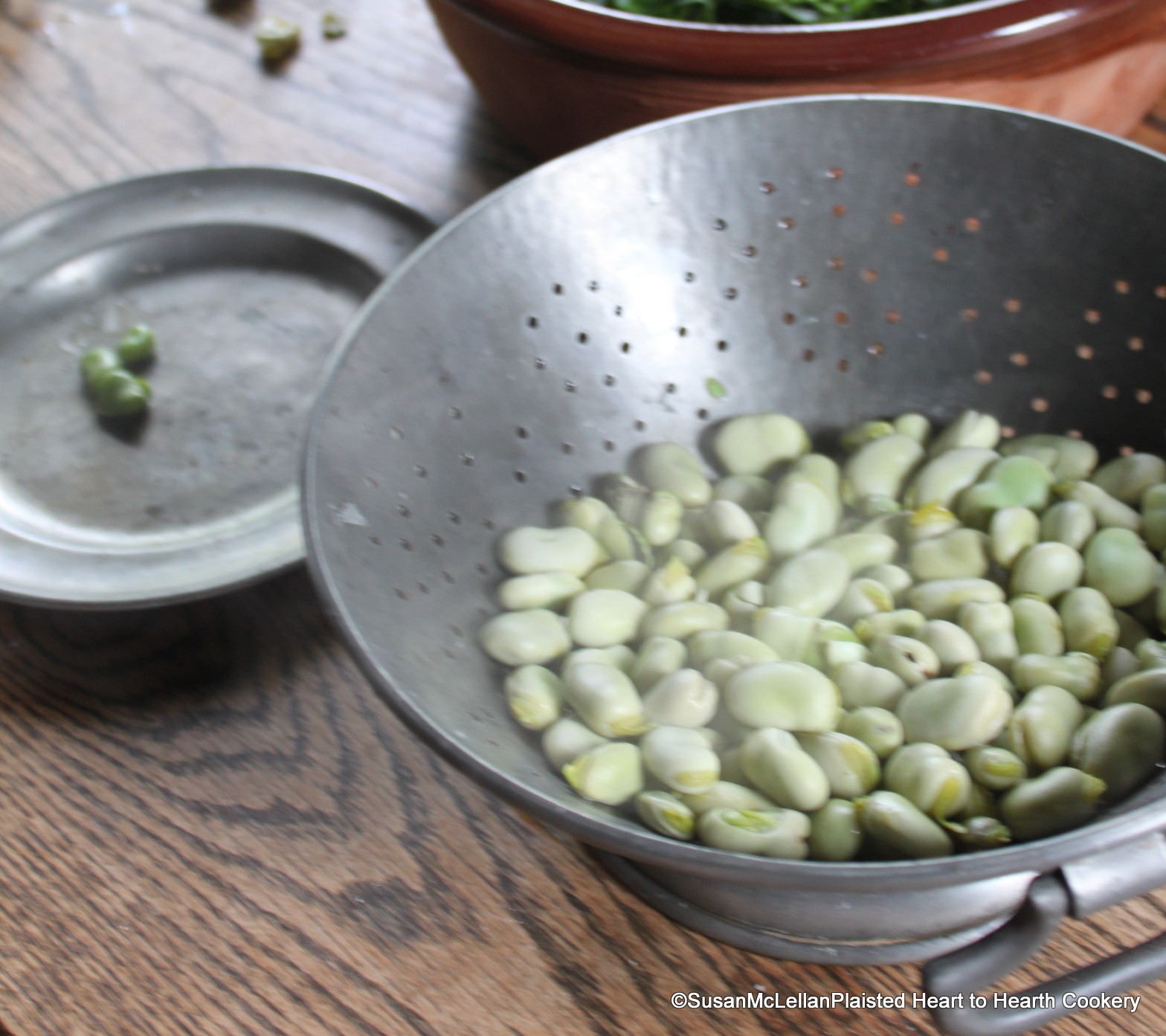 For the receipt (recipe) To stew Fava Beans, the fava beans are cooked until done, then drained. The beans are then cooled and peeled. There are a few fava beans already peeled on the pewter plate.