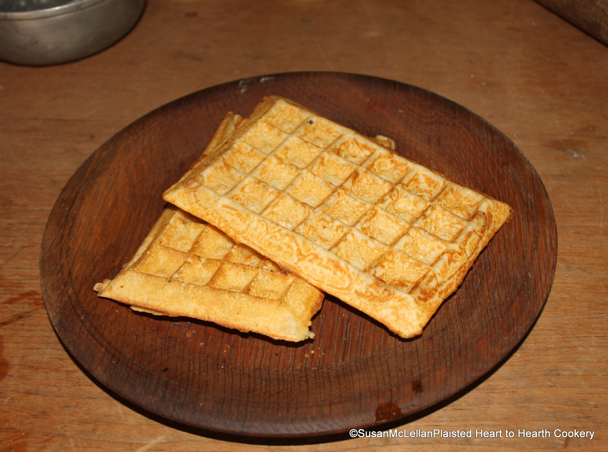 The Dutch were particularly fond of their wafel and introduced them into the New World in the early 17th century. The word gained an extra “f” and are known as waffles. The waffles pictured were baked in an early waffle iron.