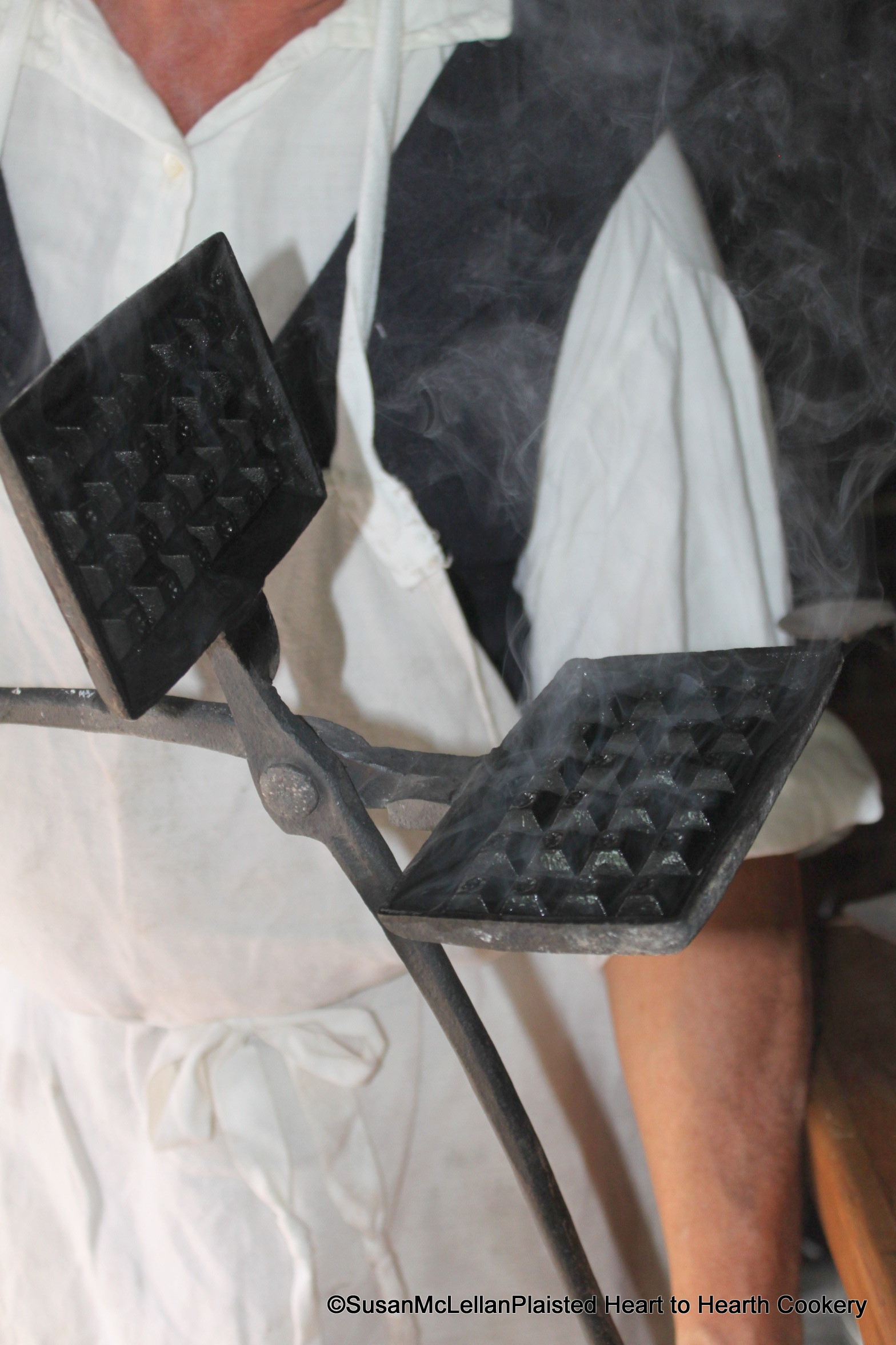 The waffle iron is heated in the glowing embers of the fire and checked for temperature by using the senses. Visually you can see the steam coming from the iron and when placed near (but not too close) to the cheeks, it is easily determined that this iron needs to cool to a proper temperature before adding batter.