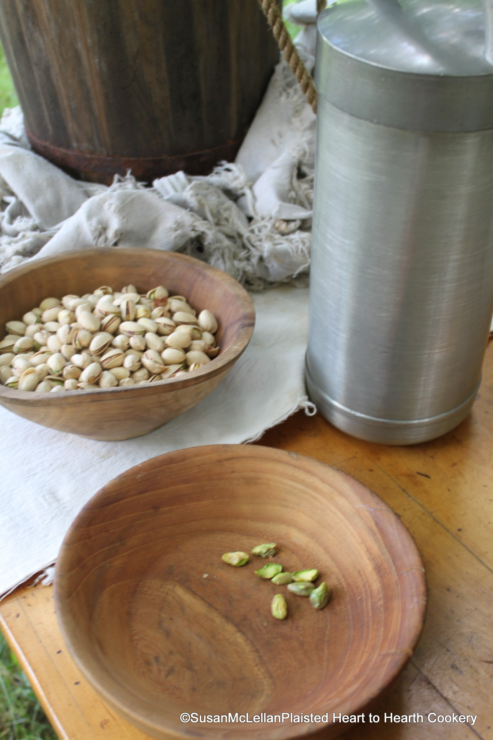 To make the 1772 receipt (recipe) for Pistachio Nut Cream Ice, the first step is to prepare the nuts. The unshelled pistachios are in the wood bowl in just to the front left of the sabotiere.