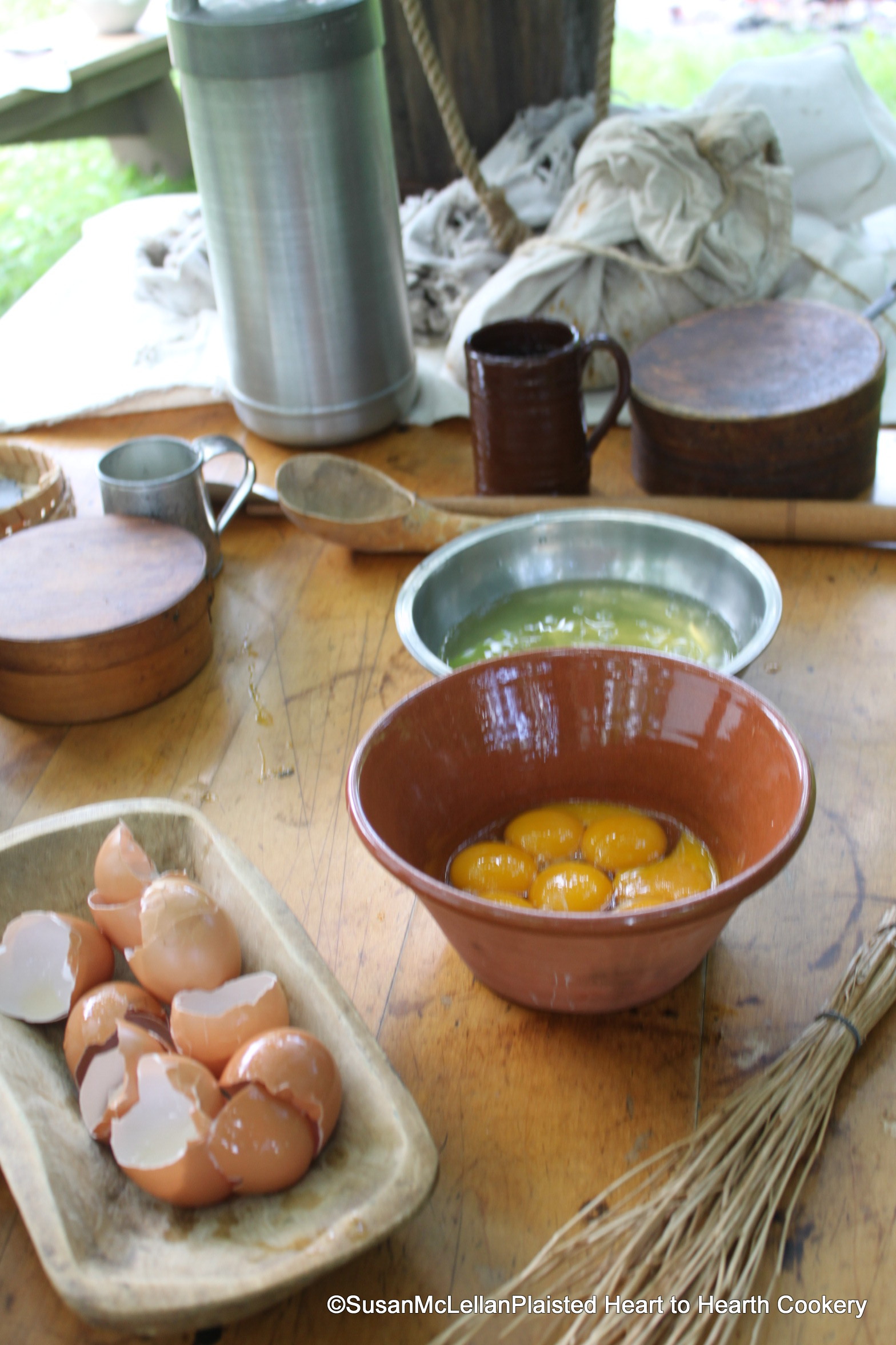 The 1772 receipt (recipe) for Pistachio Nut Cream Ice describes 4 yolks of eggs for every pint of cream you are to employ. For the two pints of cream used, it required eight egg yolks.