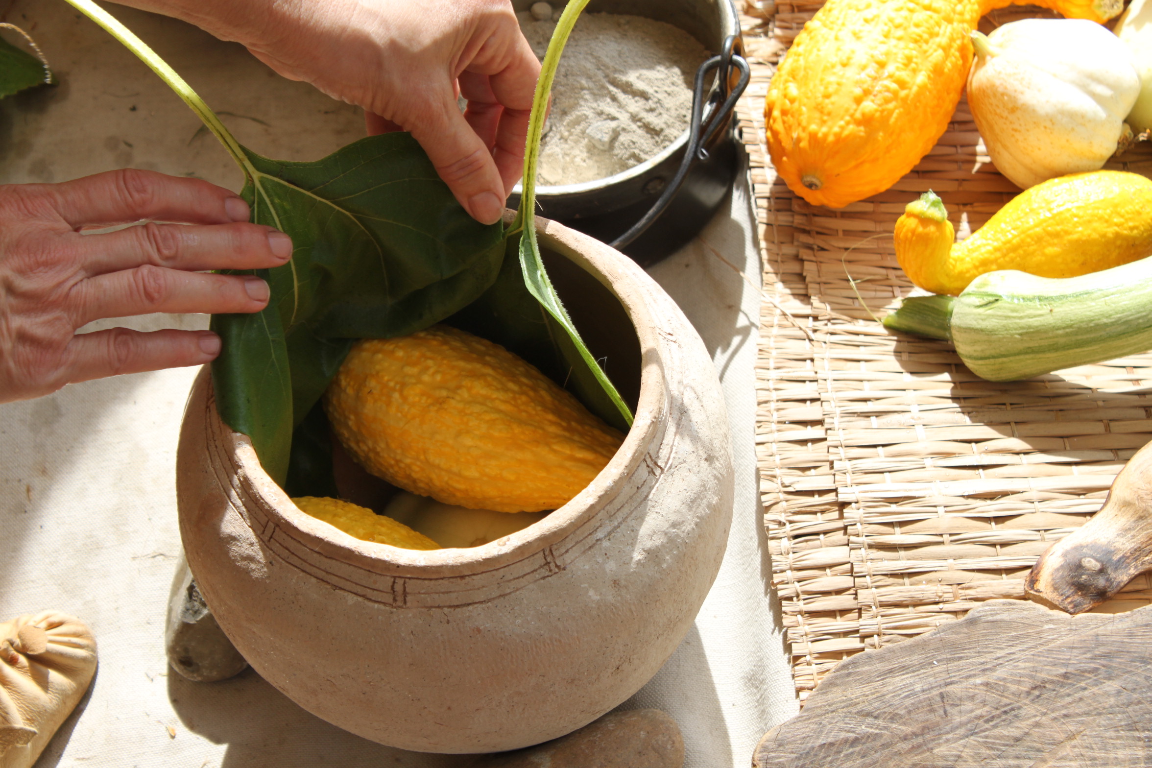 Once a few fresh, small squash were in the pot, the leaves of the sunflower that had been kept flexible by immersion in water, were placed stem upward and upper surface of the leaf inward, between the squash and the sides of the clay pot.