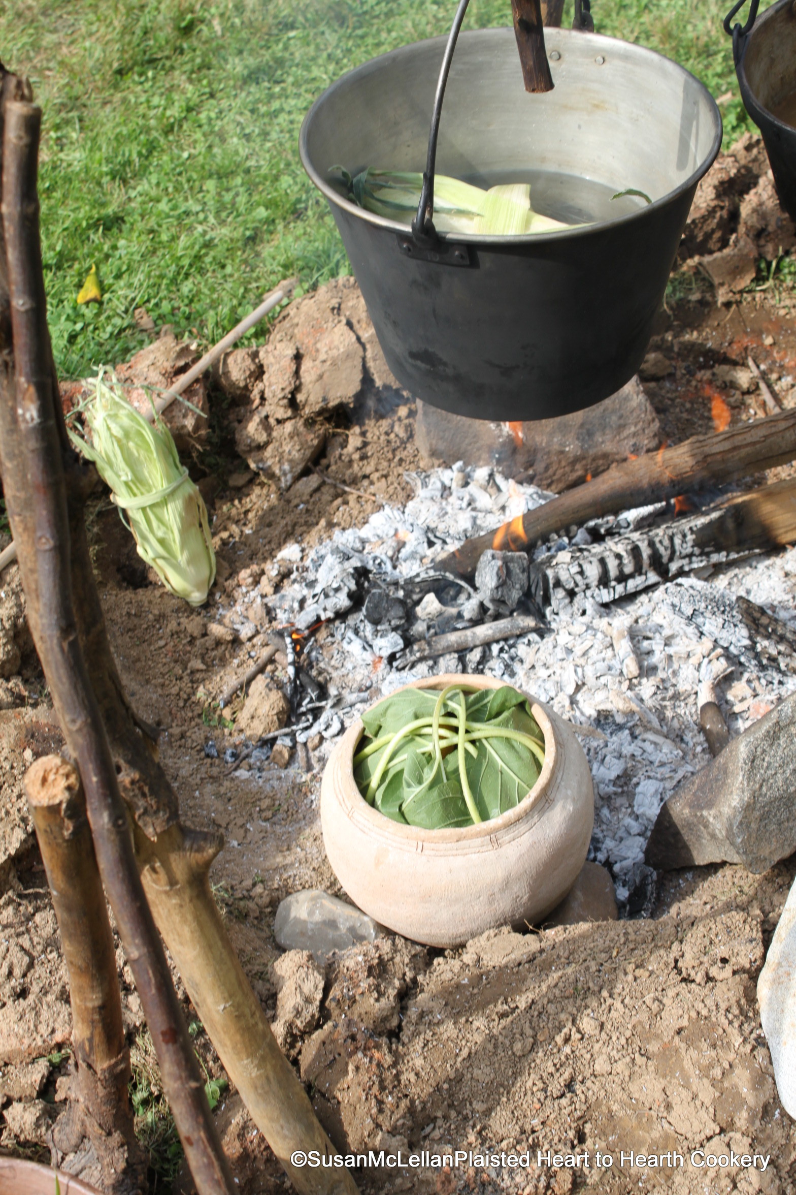 The clay pot, filled with fresh, young squash and covered with four sunflower leaves intertwined, is supported by three rocks beside the main fire. Embers from the fire are moved to surround the pot to provide the heat for cooking.